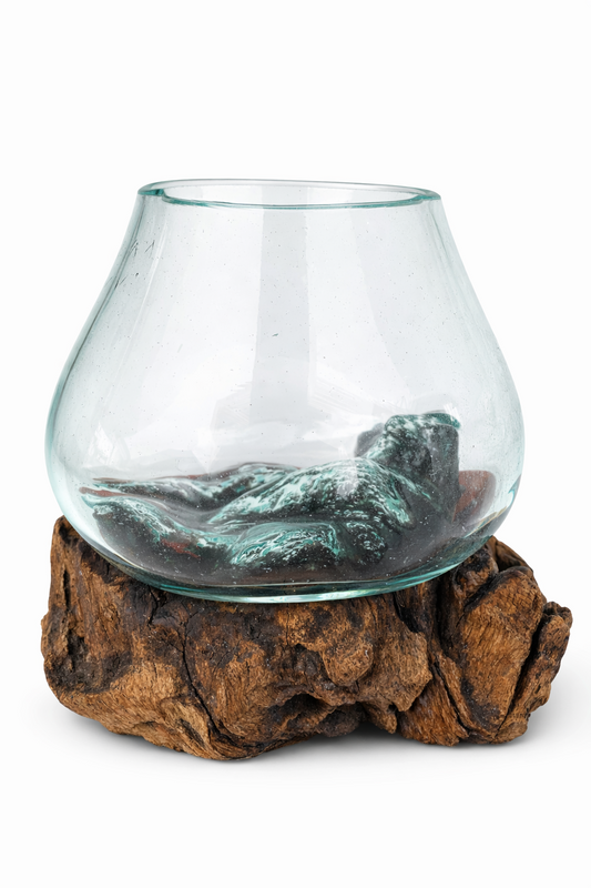 Bring a touch of nature and craftsmanship into your home with this stunning handcrafted molten glass bowl perfectly balanced on driftwood Imported from Bali Indonesia, skillfully made by local bali artisans.